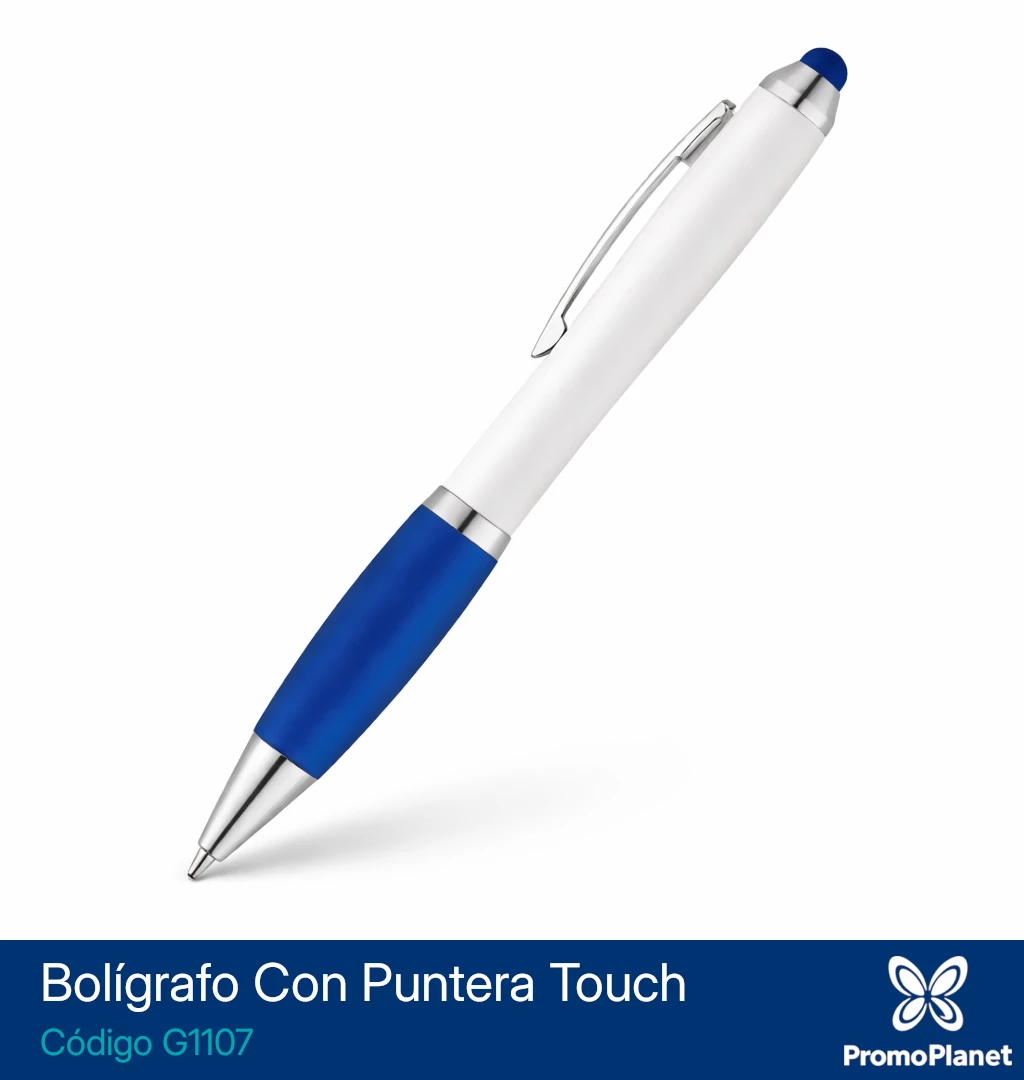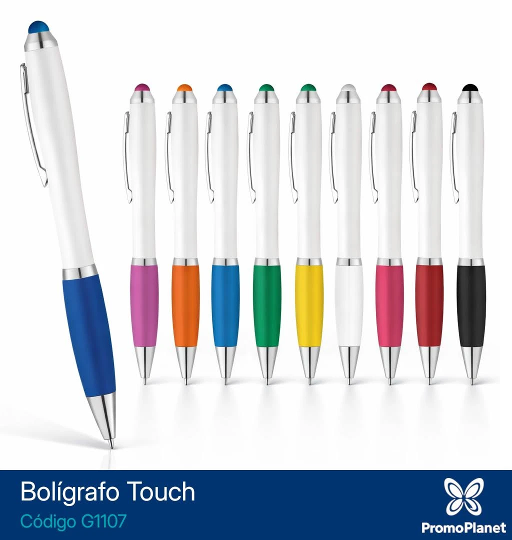 El Bolígrafo Touch G1107 presenta un barril blanco con grip y puntera touch de color, ideal para dispositivos táctiles.