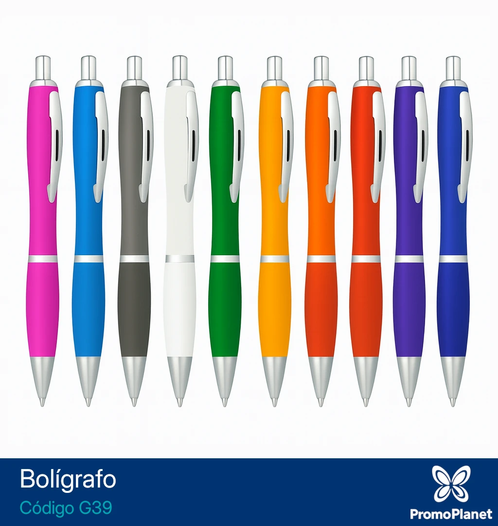 El bolígrafo G39 presenta un barril de plástico opaco en varios colores, grip al tono y clip metálico.