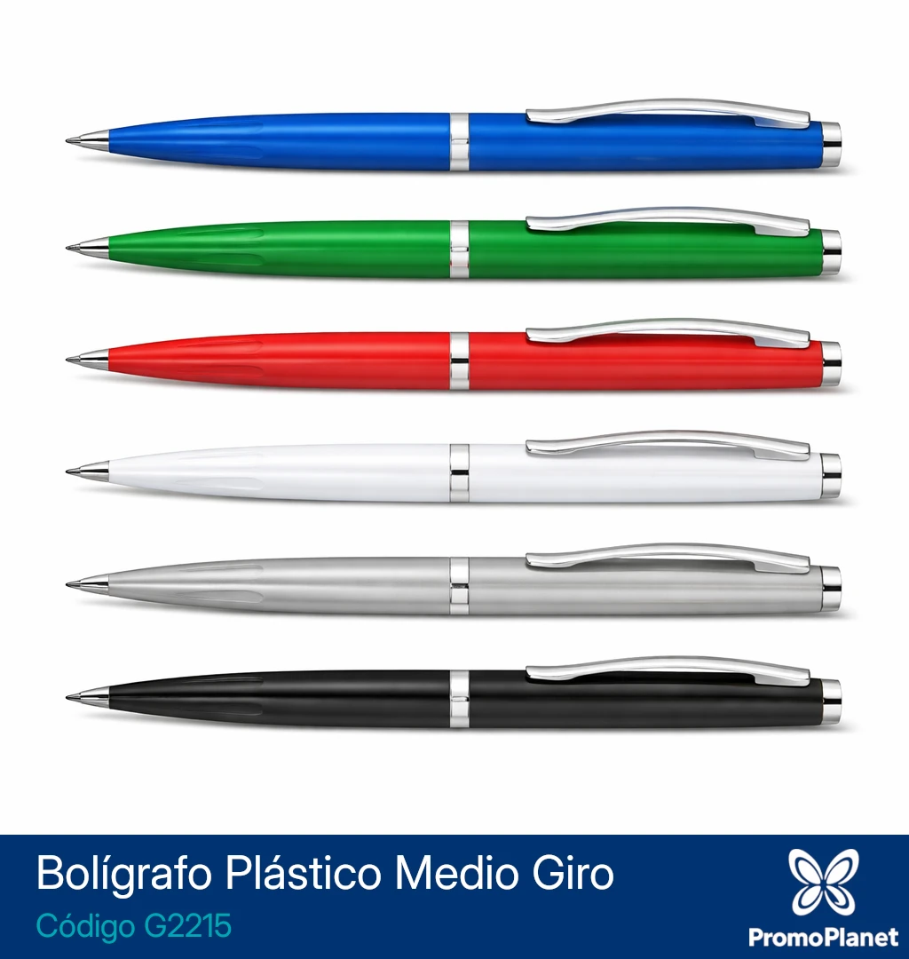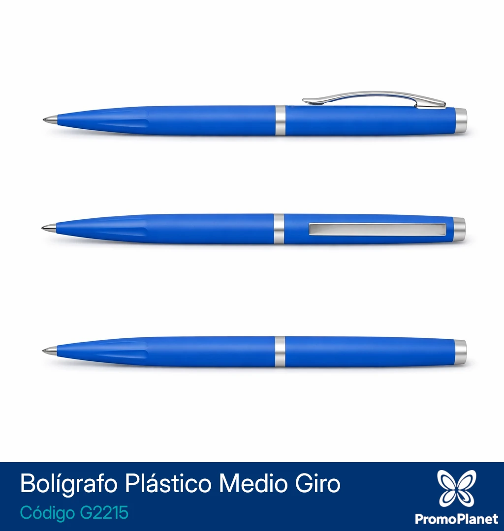 El bolígrafo G2215 está fabricado en plástico con acabado liso y diseño estilizado.