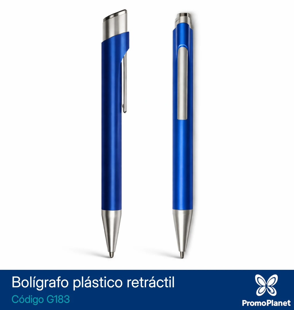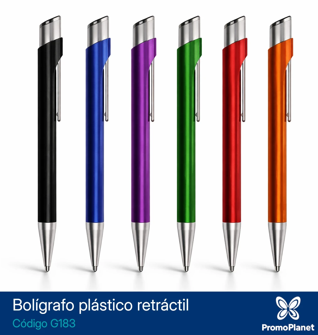 El bolígrafo G183 es retráctil y está fabricado en plástico, con cuerpo en colores variados.