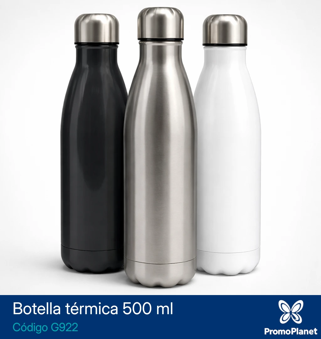 Con capacidad de 500 ml, presenta diseño estilizado y tapa plástica a rosca recubierta en metal, que asegura un cierre firme.