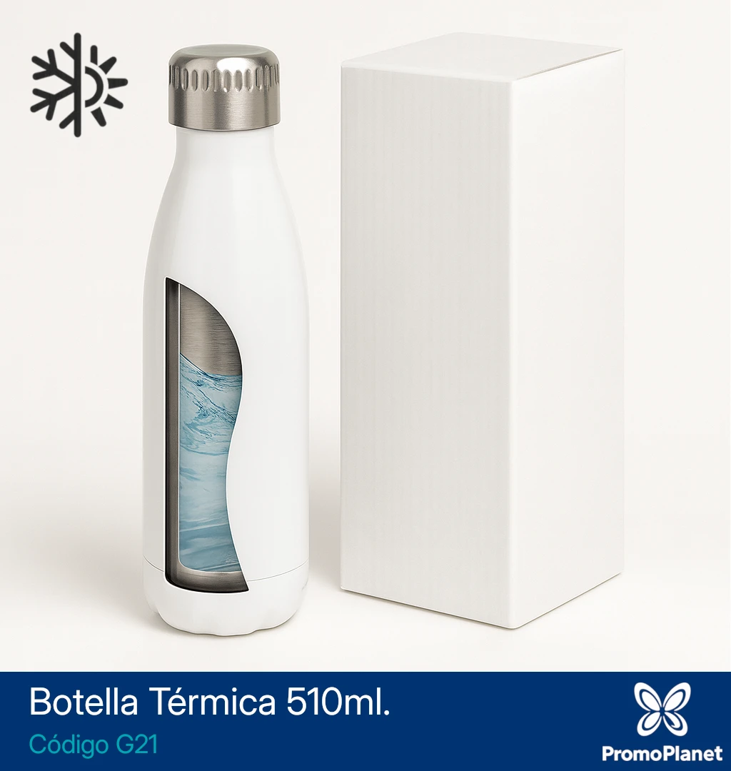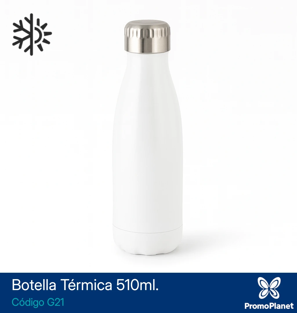 La botella G21 está fabricada en acero inoxidable de doble pared con cámara de vacío, lo que le otorga propiedades térmicas para conservar la temperatura por más tiempo.