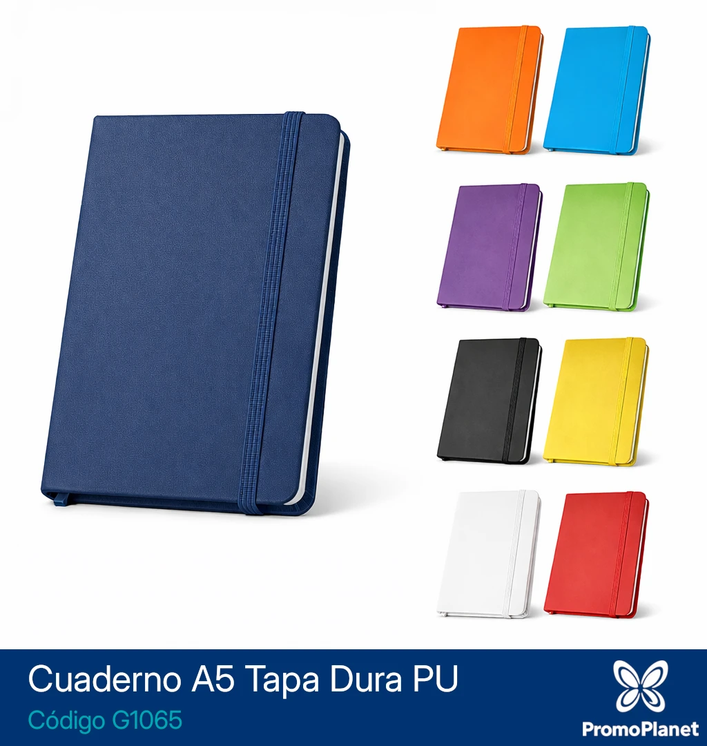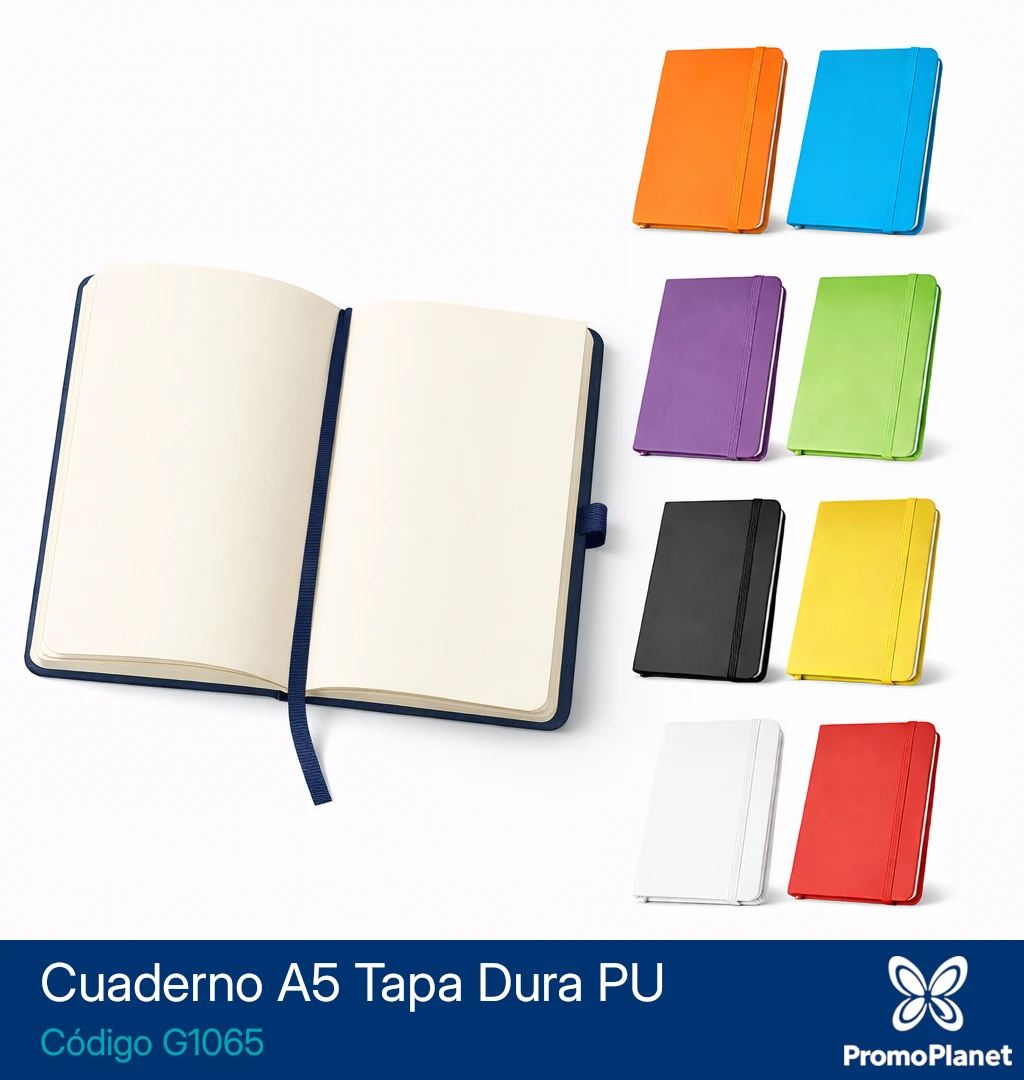El cuaderno G1065 presenta formato A5 con tapa dura recubierta en PU, ofreciendo una superficie resistente y adecuada para uso diario.