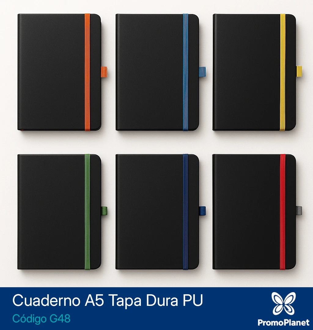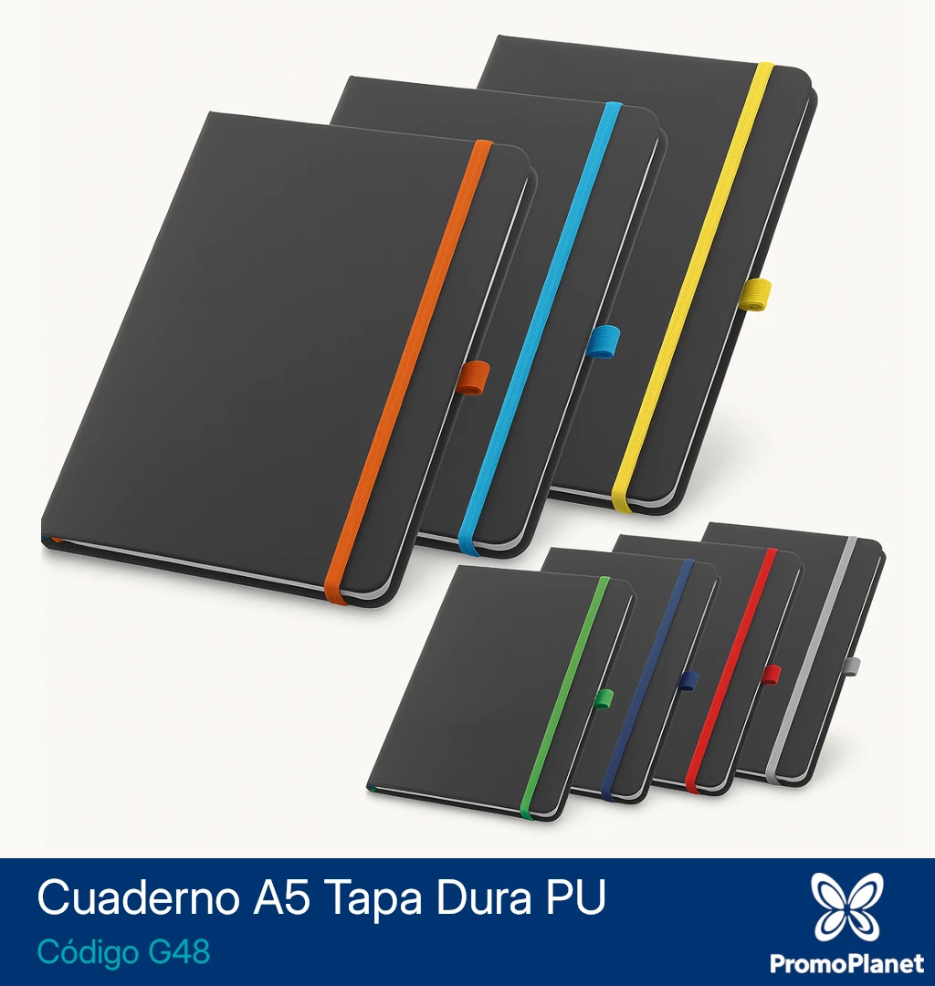 Incorpora cinta señalador, cierre elástico y portalápices al tono.