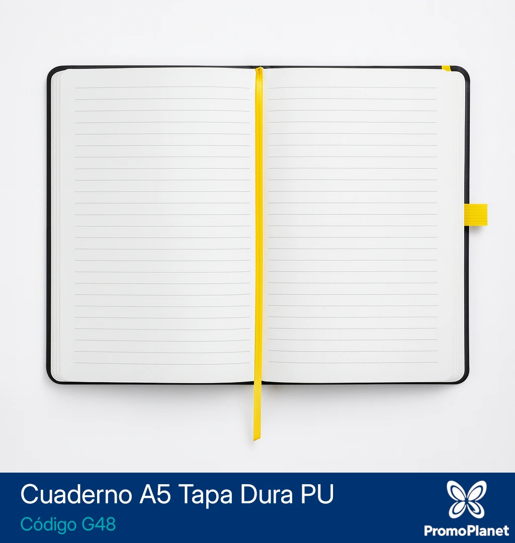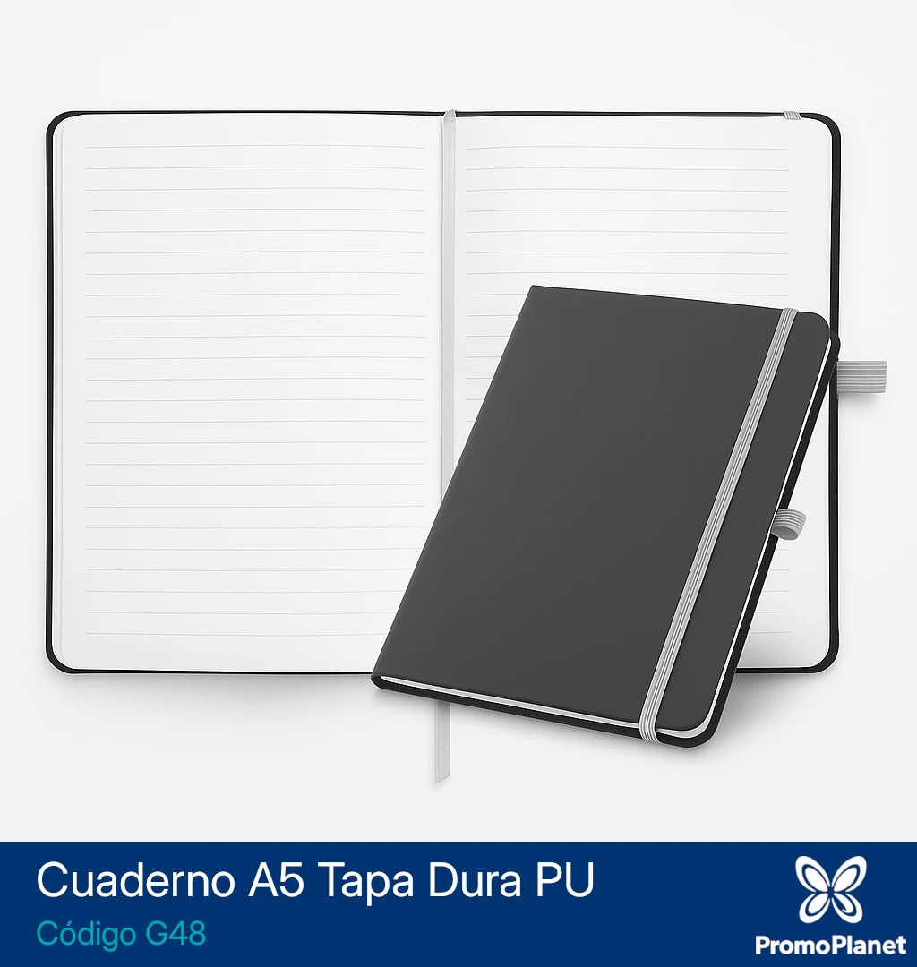 El cuaderno G48 en formato A5 cuenta con tapa dura de PU negro y 80 hojas rayadas de 70 g/m².