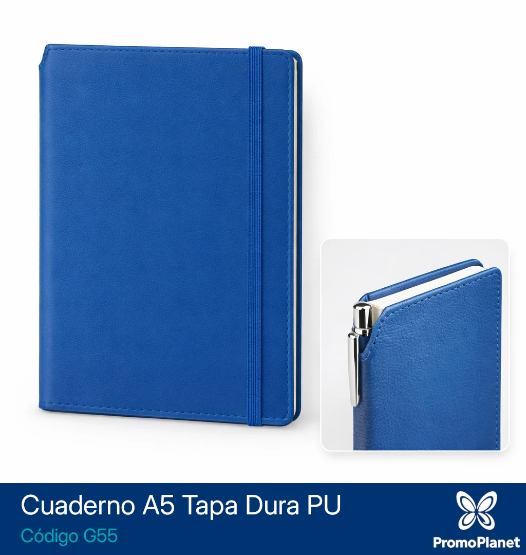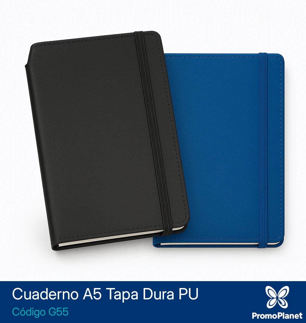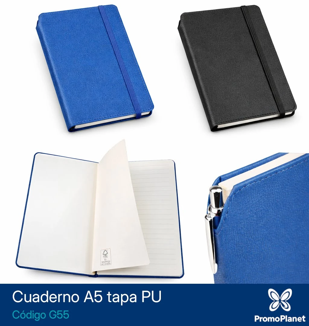 El cuaderno G55 es formato A5 y cuenta con tapa dura en PU.