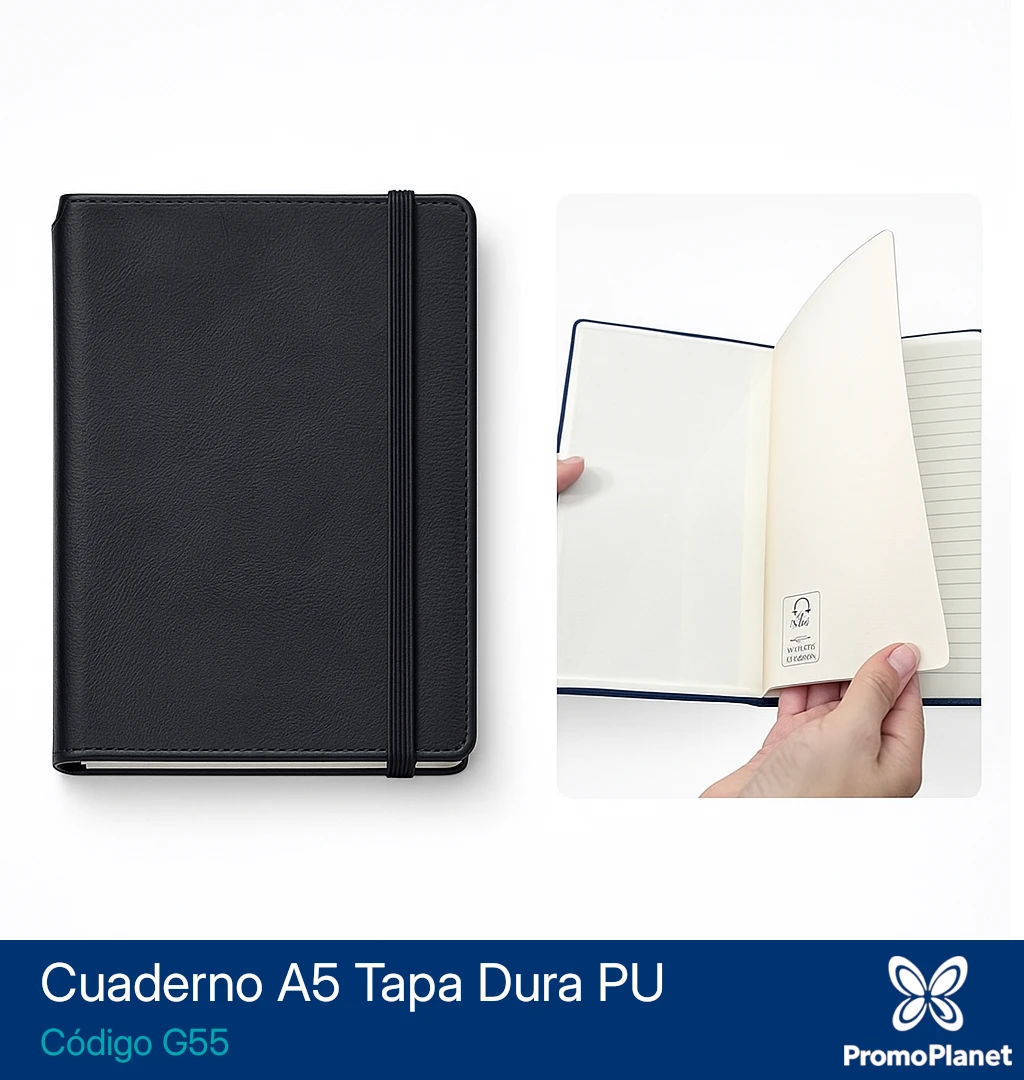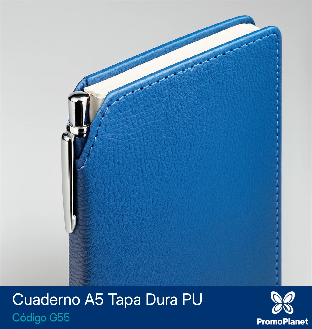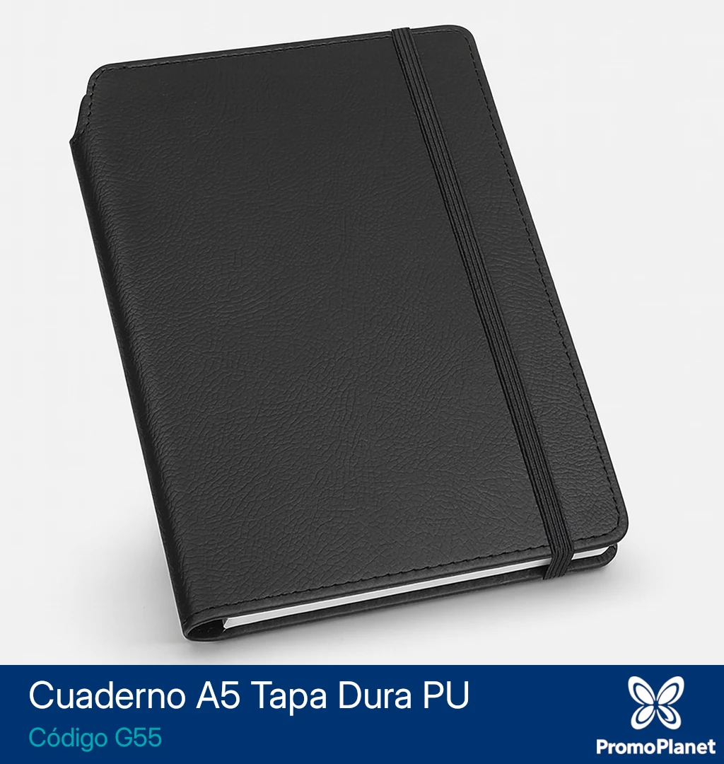 El cuaderno G55 es formato A5 y cuenta con tapa dura en PU.