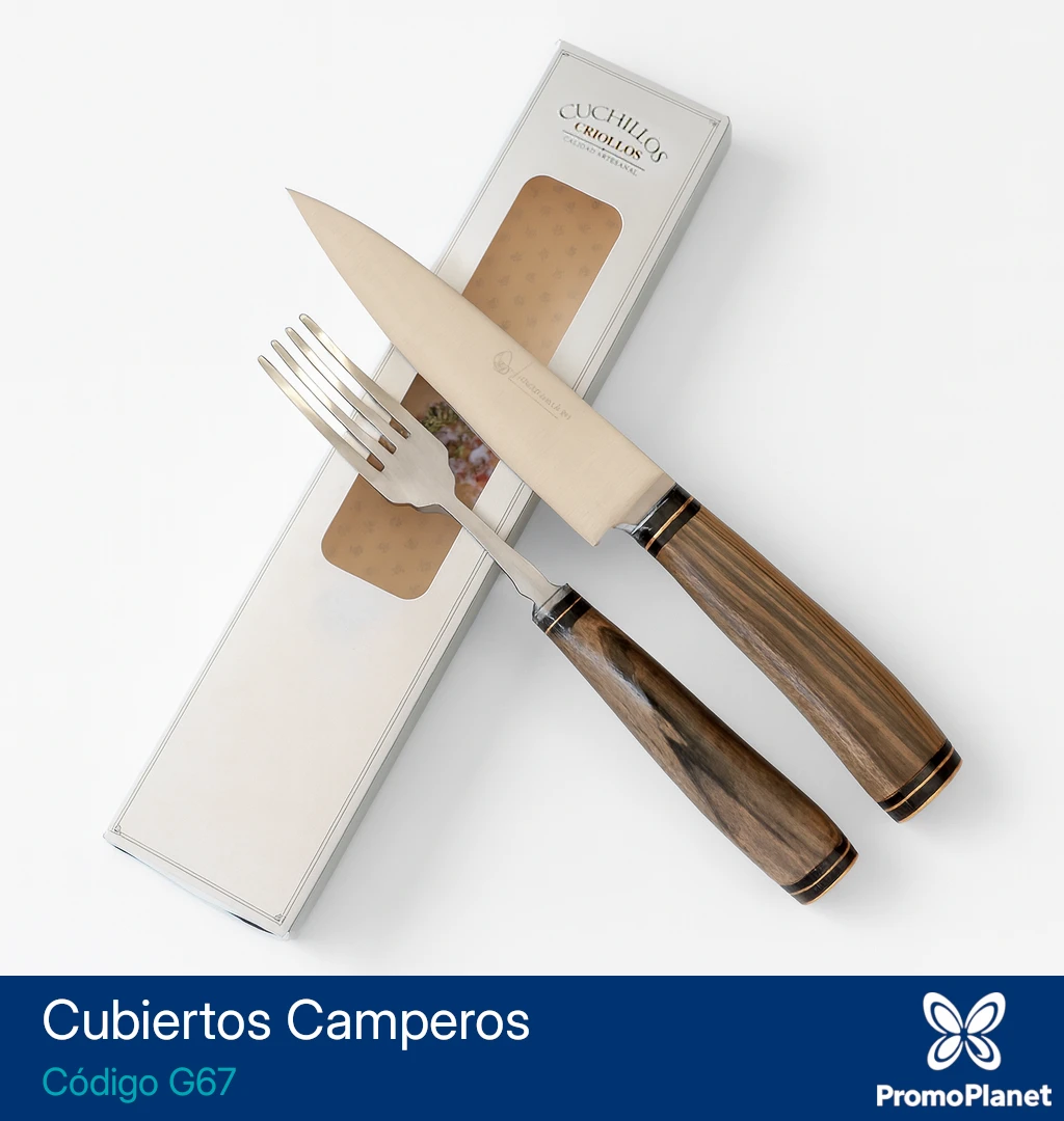 El set G67 incluye cuchillo y tenedor artesanales fabricados en acero inoxidable El Estribo, con cabos de madera autóctona seleccionada.
