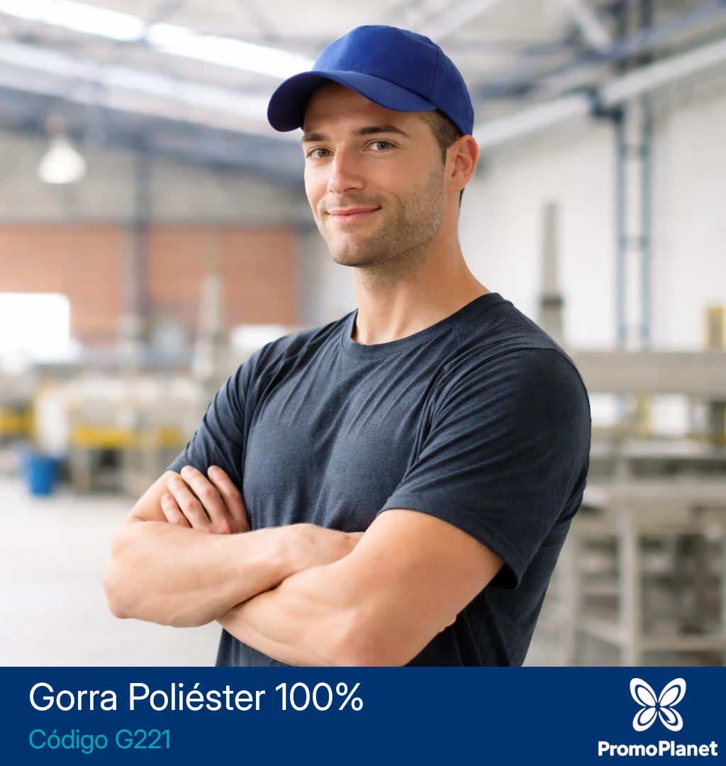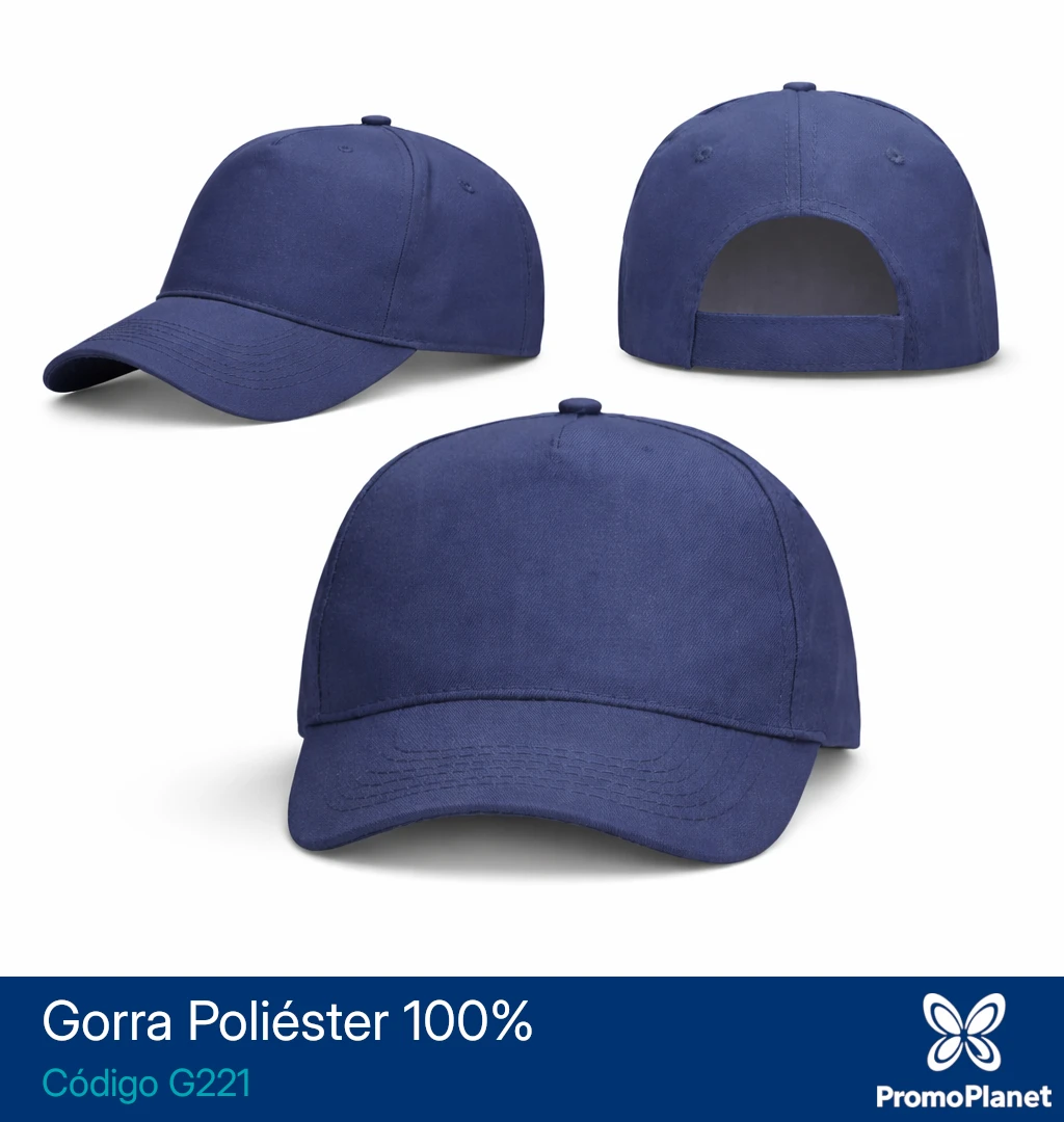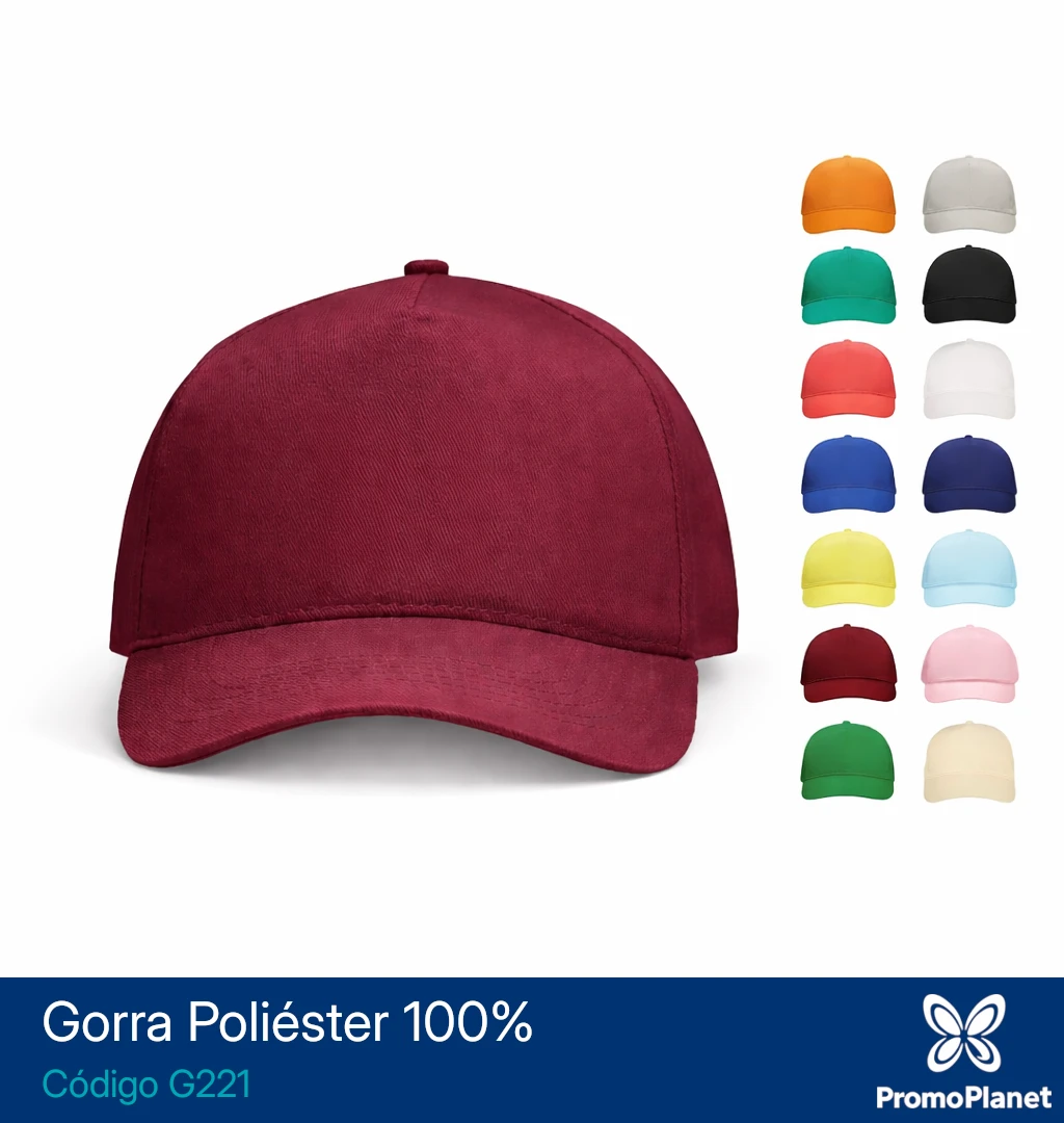 El gorro G221 está confeccionado en poliéster 100% y presenta un diseño de 5 paneles, liviano y cómodo para uso diario.