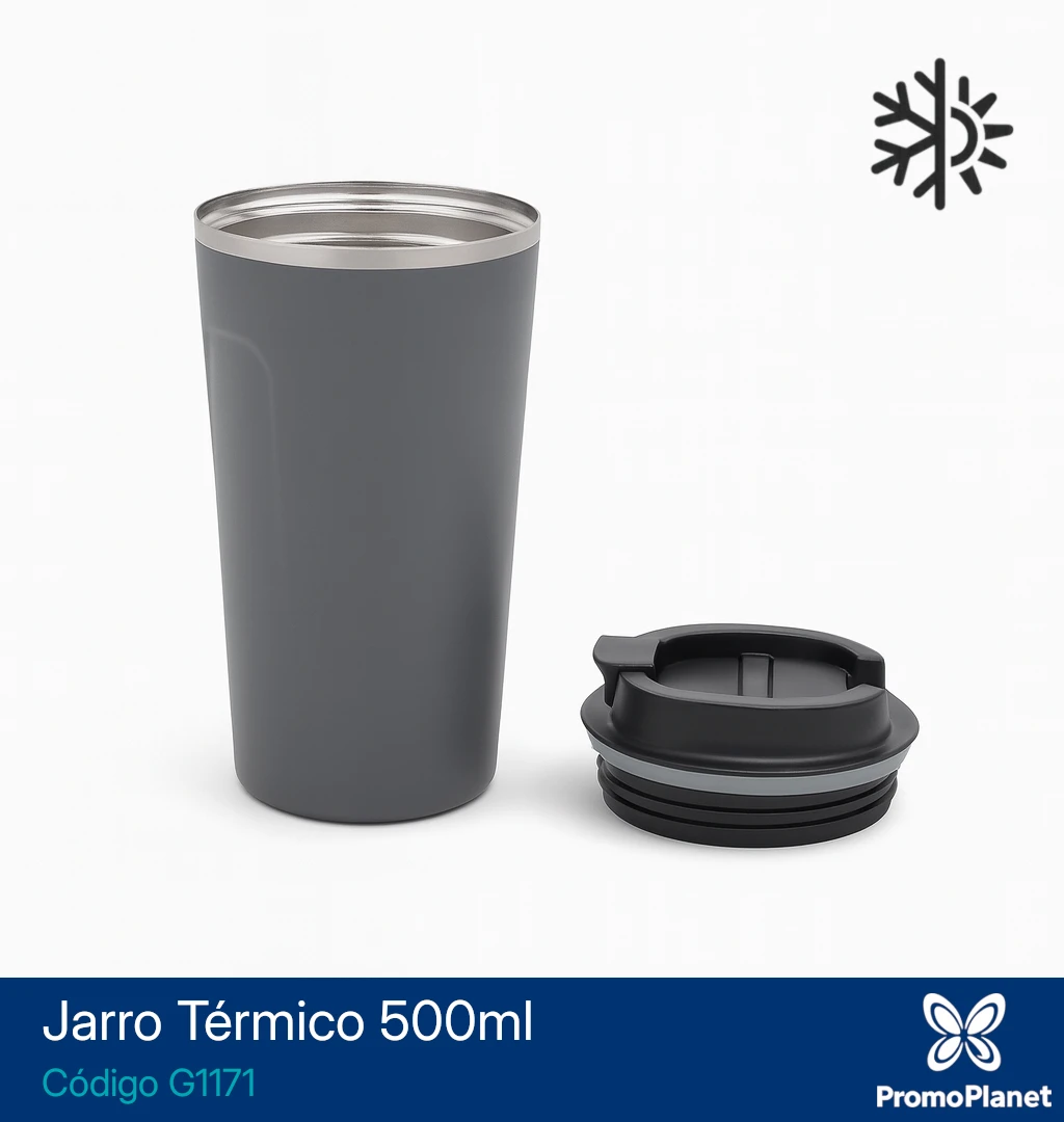 Es reutilizable y apto para bebidas frías o calientes, con una capacidad de 500 ml.