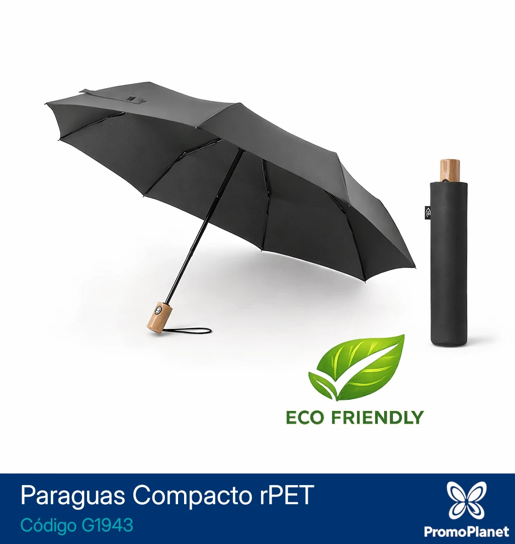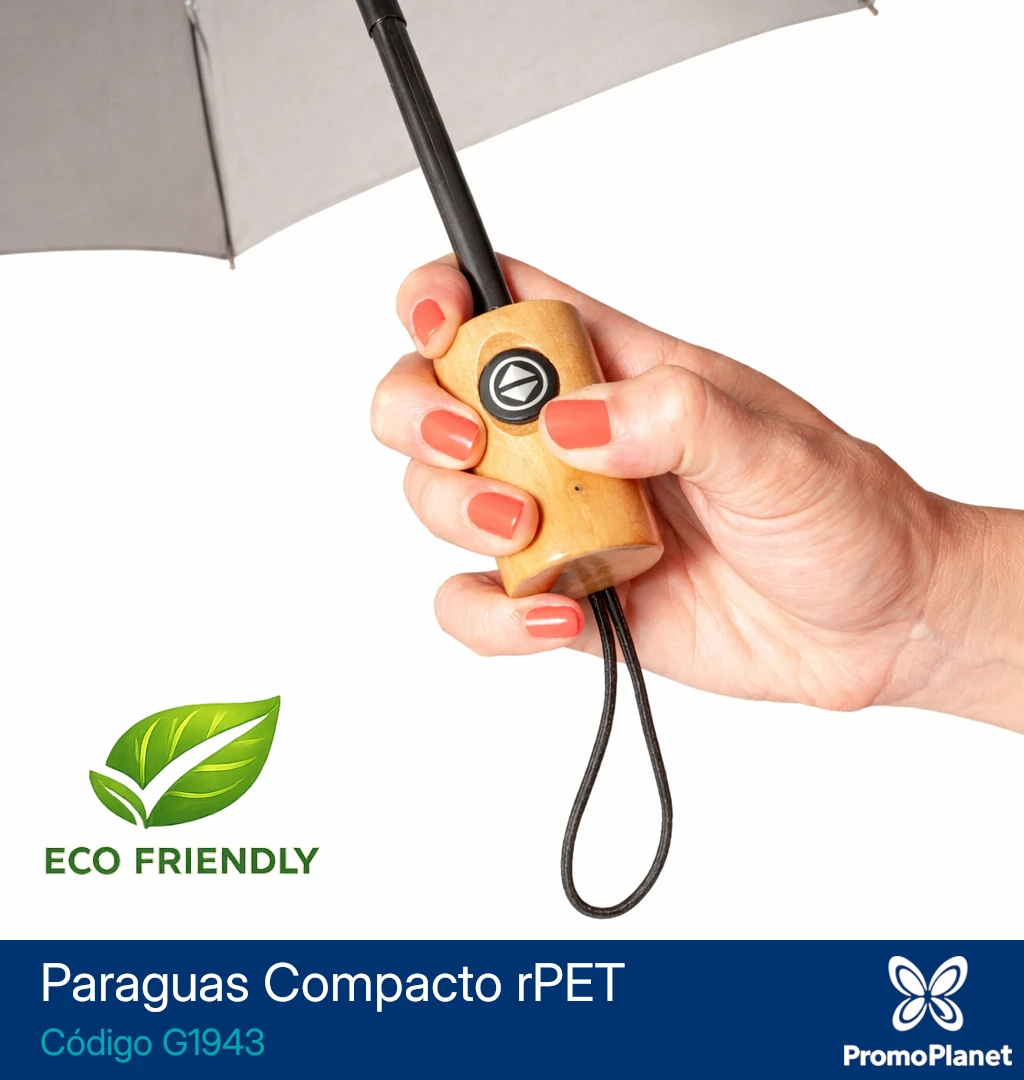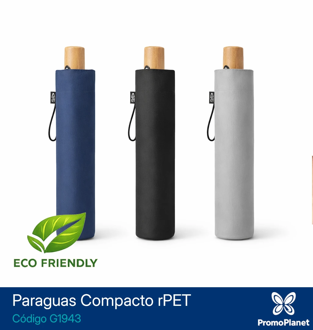 El paraguas compacto rPET G1943 está confeccionado con tela impermeable 100 % rPET, elaborada a partir de plástico reciclado.