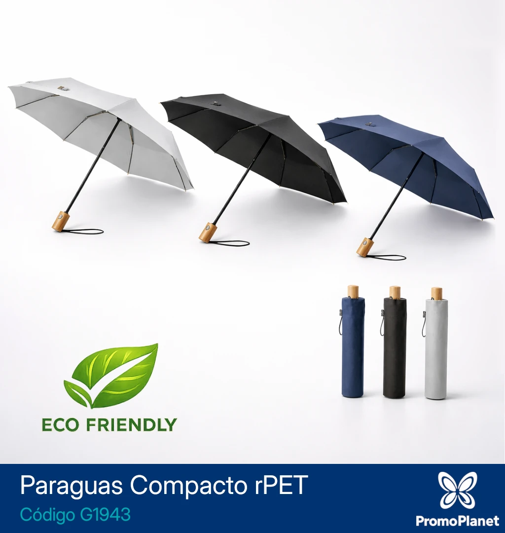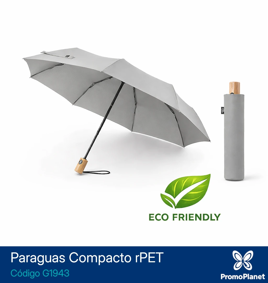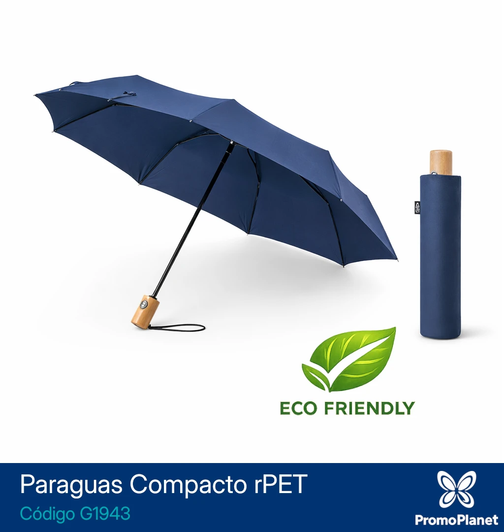 El paraguas compacto rPET G1943 está confeccionado con tela impermeable 100 % rPET, elaborada a partir de plástico reciclado.