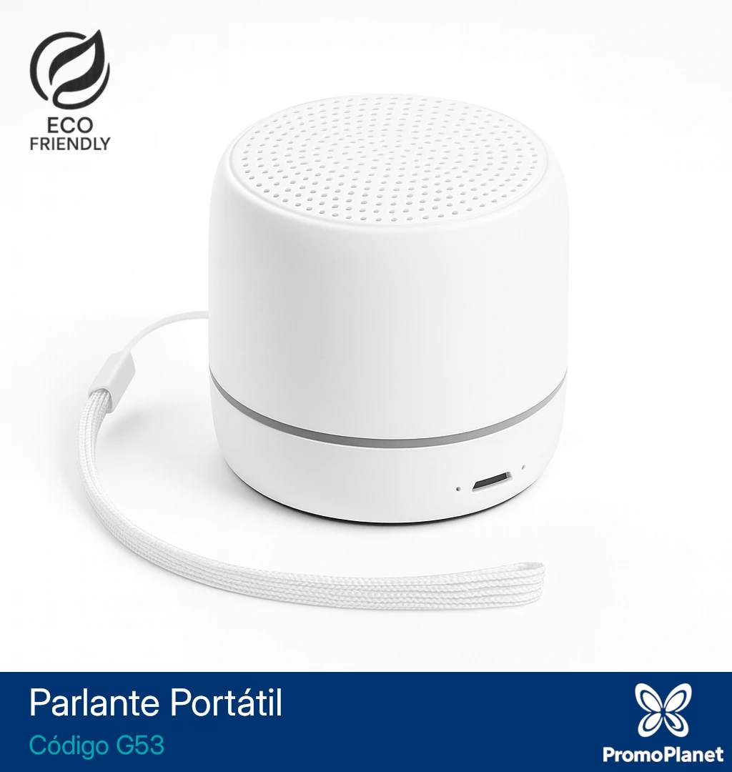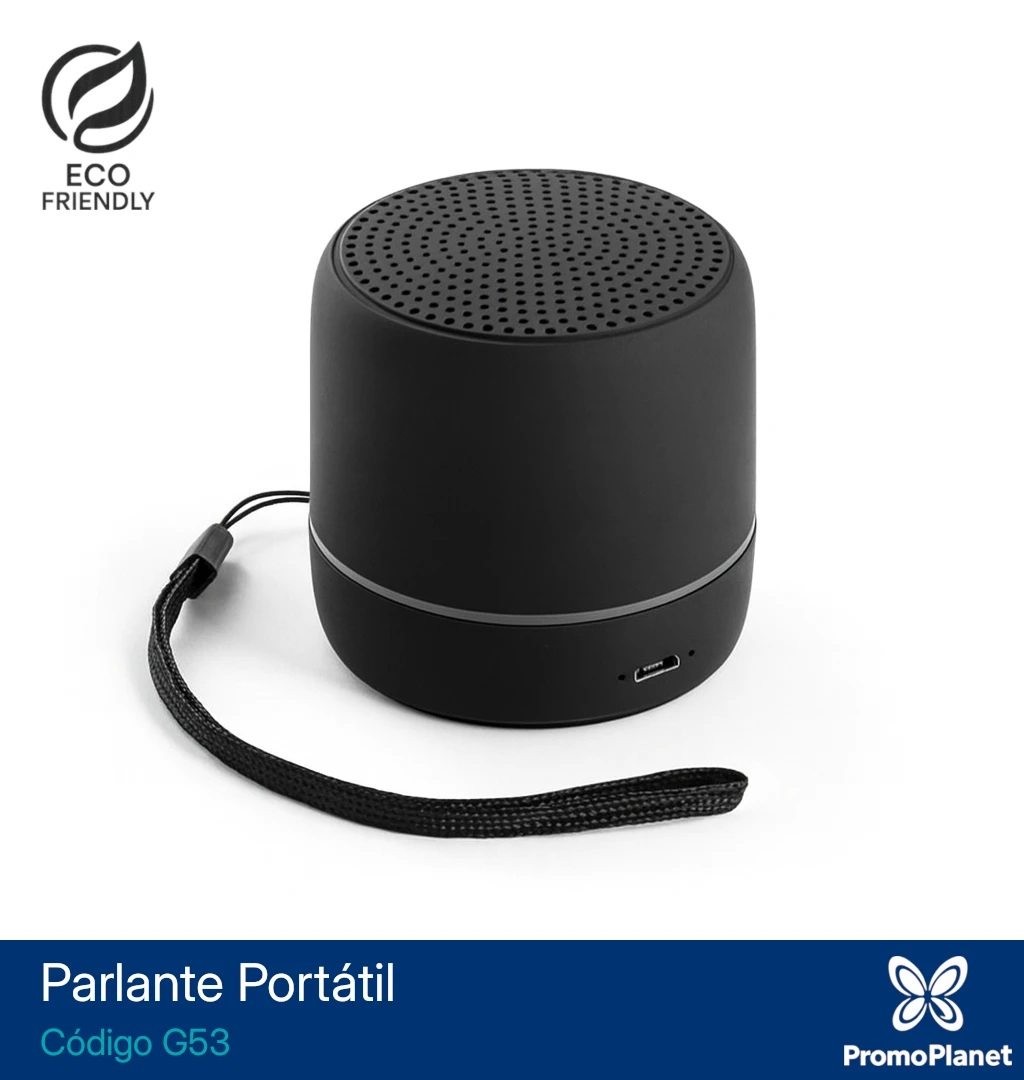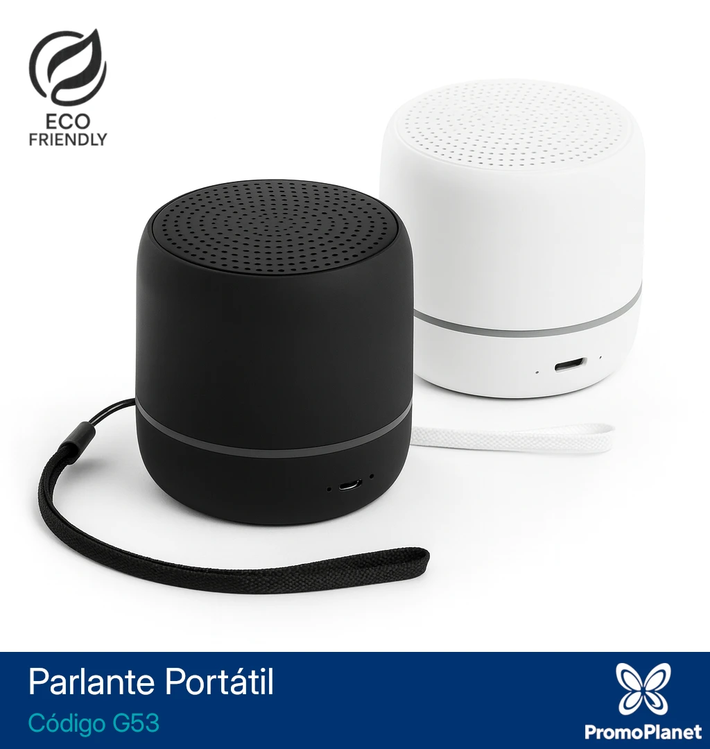 El parlante portátil G53 está fabricado en ABS reciclado (100% rABS) e incorpora una tira LED para uso en exterior.