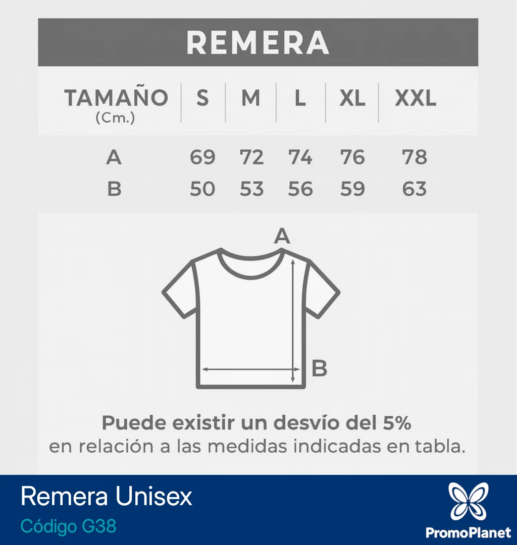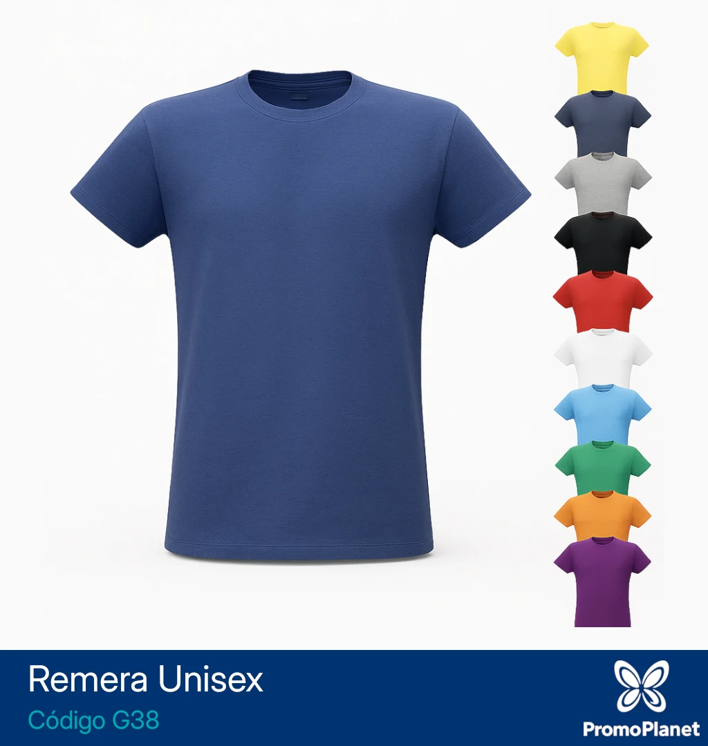 La remera G38 es un modelo unisex de corte regular, confeccionado en algodón 100% de 135 g/m² con hilado mixto 30/1.