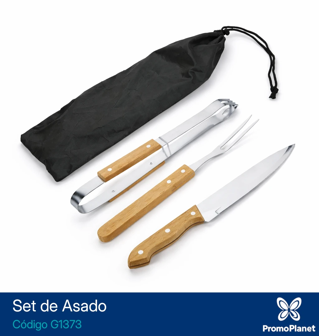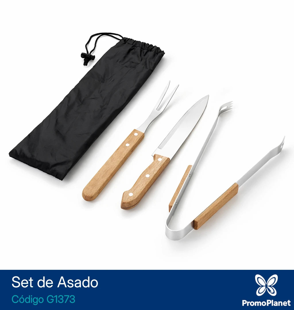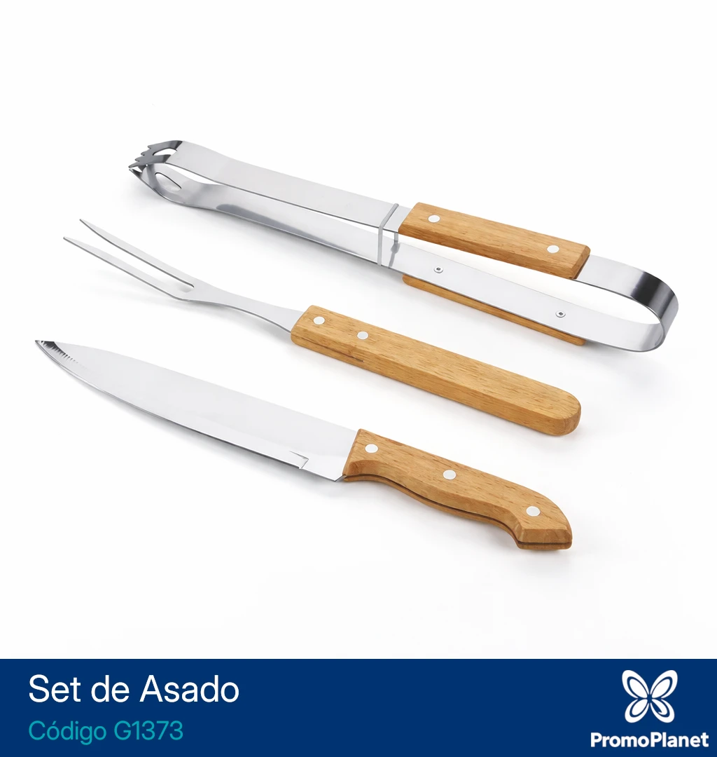 Incluye cuchillo, tenedor trinchador y pinza para asado, pensados para una manipulación precisa de los alimentos.