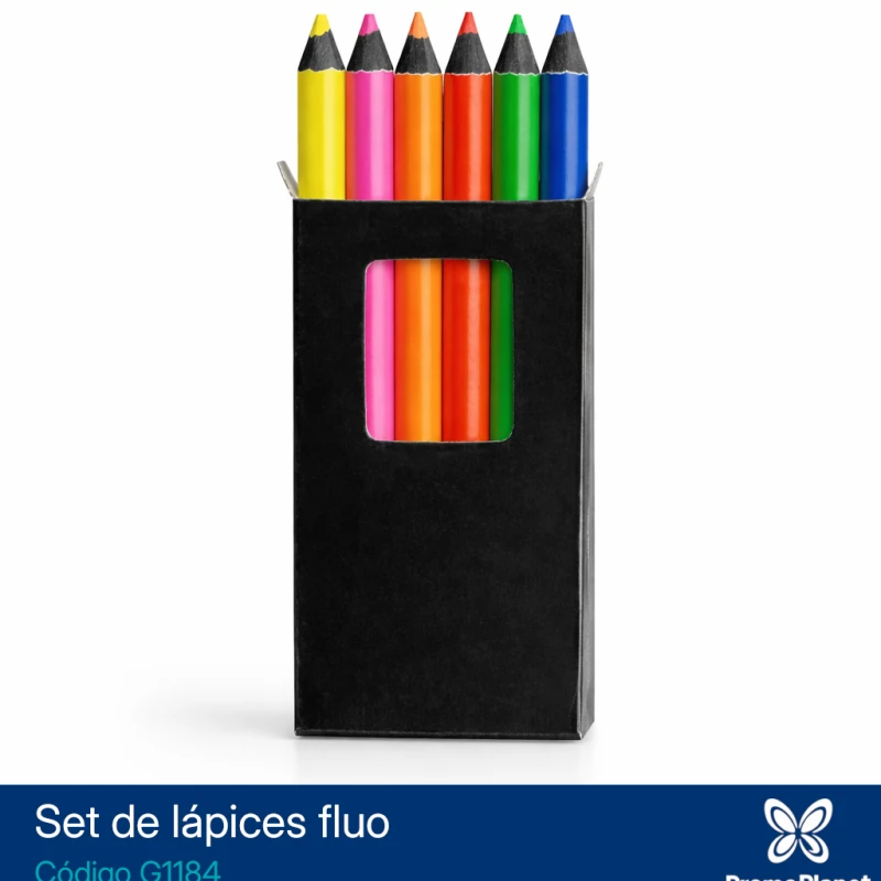 El set G1184 incluye 6 lápices cortos fluorescentes de madera, en colores intensos y llamativos.