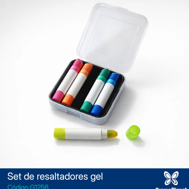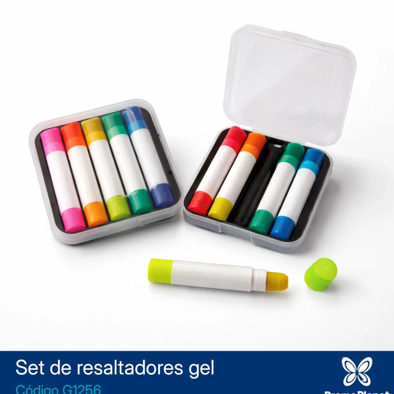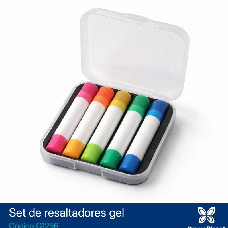 El set G1256 incluye 5 resaltadores de gel en colores surtidos, presentados en un estuche plástico rígido.