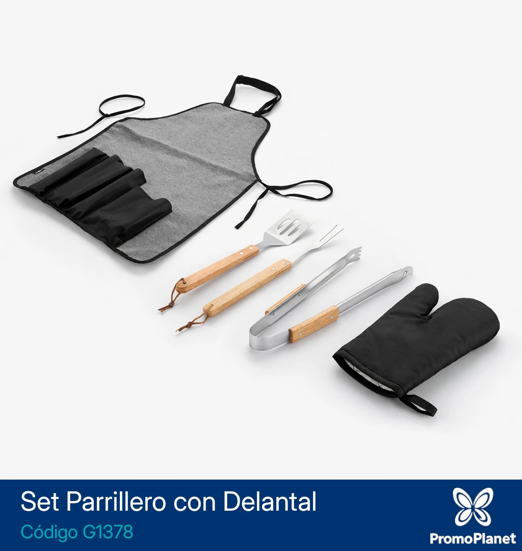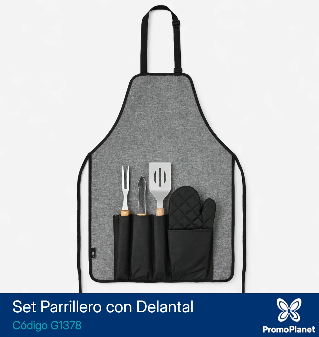 El set parrillero con delantal G1378 reúne utensilios y accesorios pensados para una experiencia de asado práctica y organizada.
