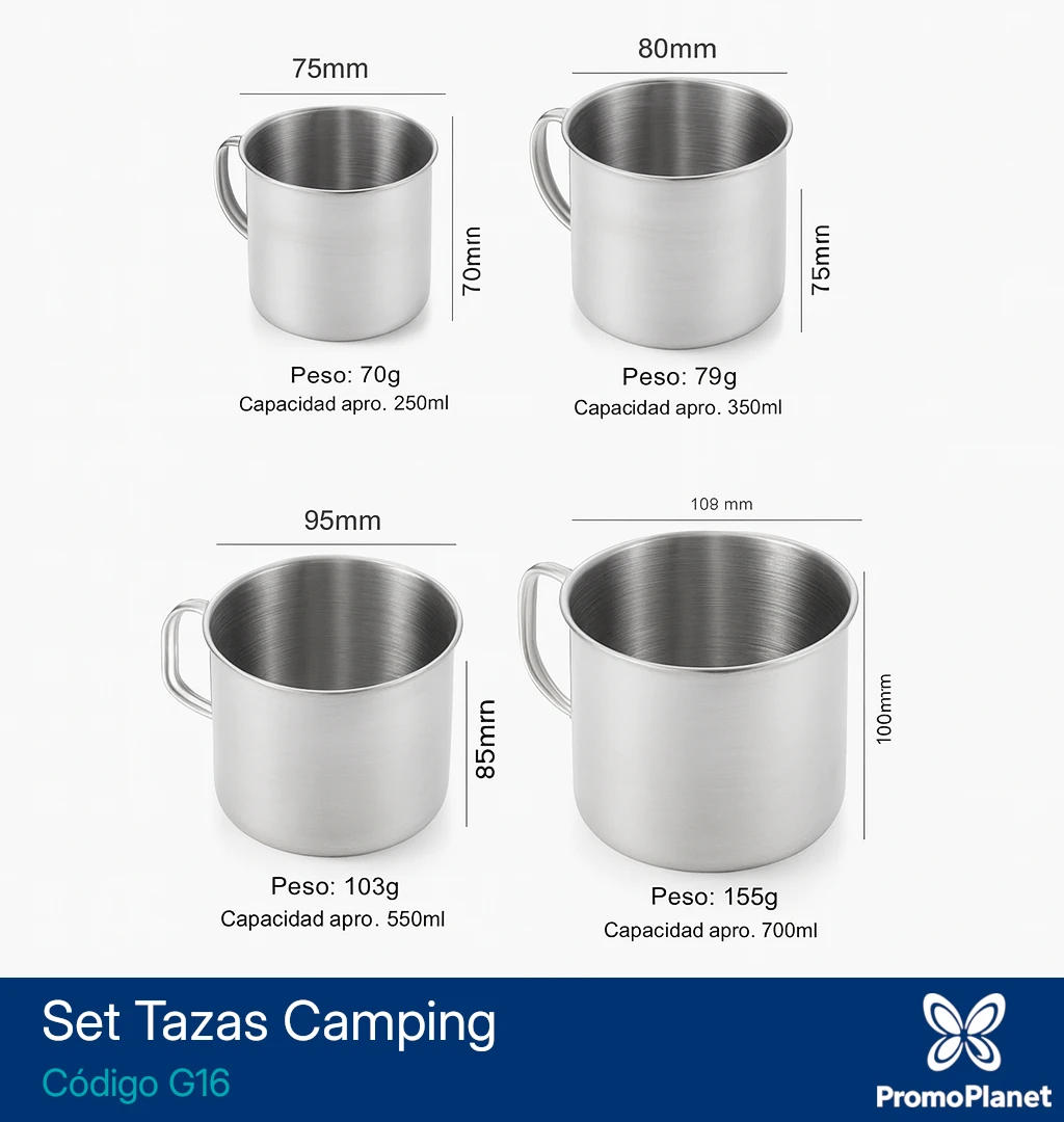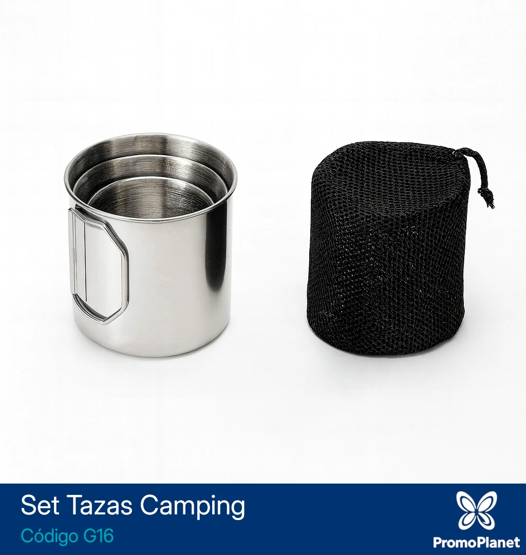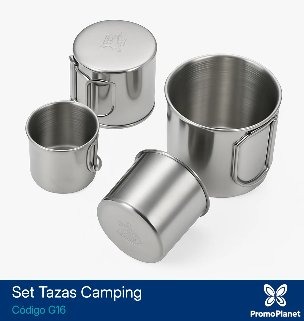 El set de tazas de camping G16 está fabricado en acero inoxidable y cuenta con asas plegables que facilitan su transporte.