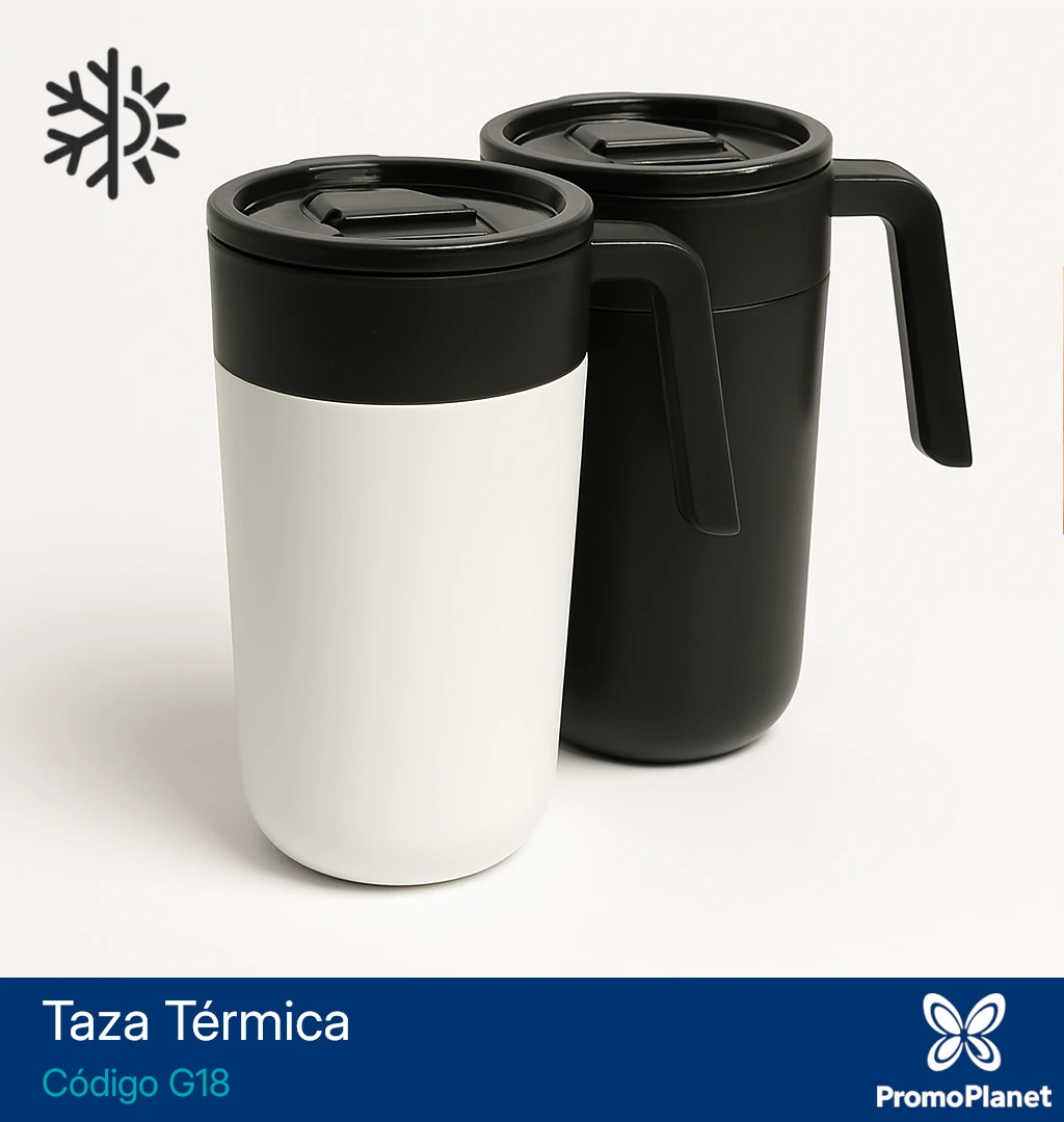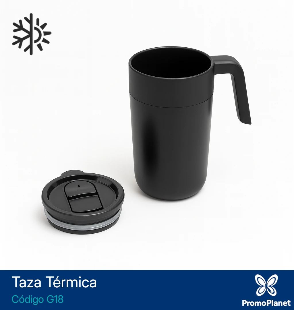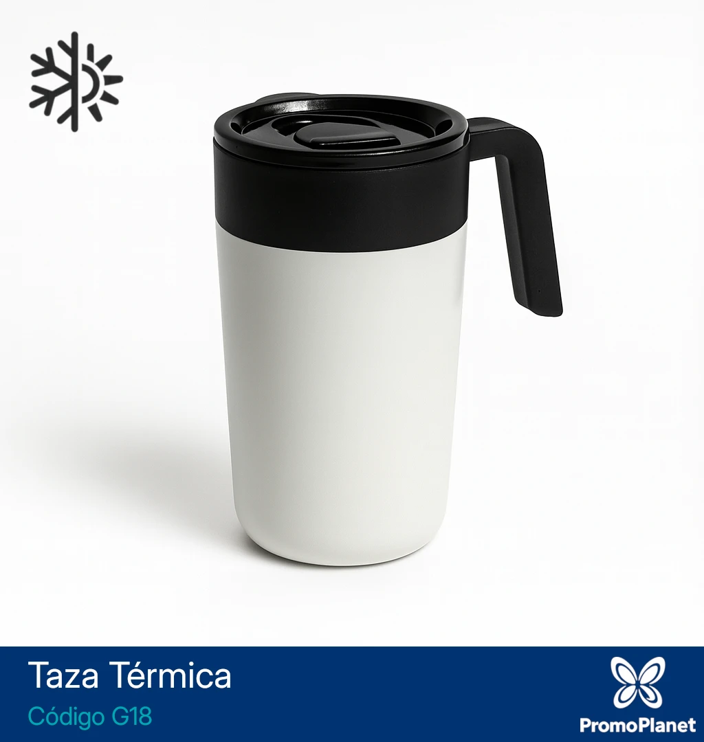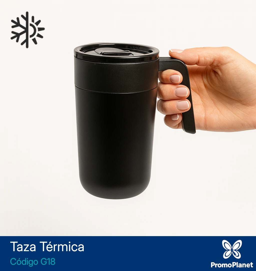 La taza térmica G18 cuenta con doble pared, con interior de polipropileno y exterior de acero 201 con terminación mate.
