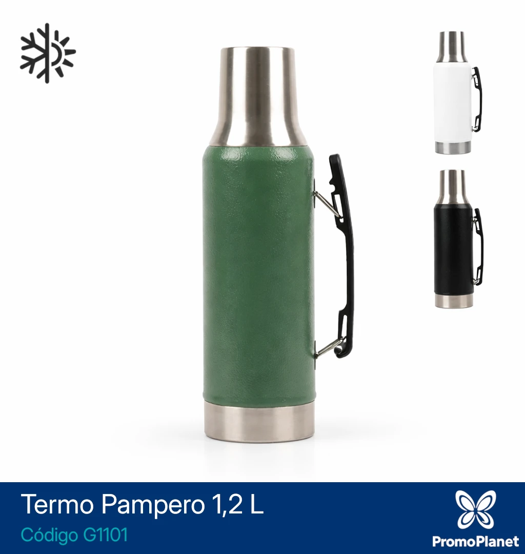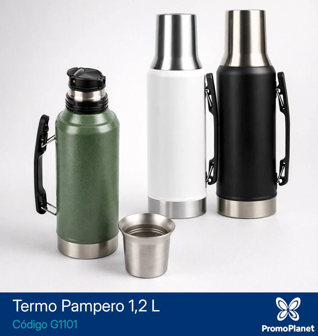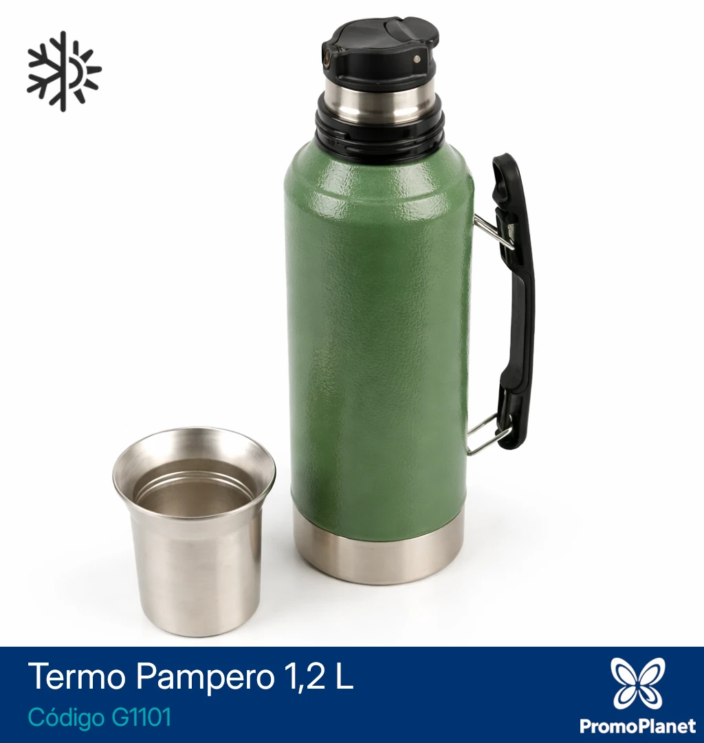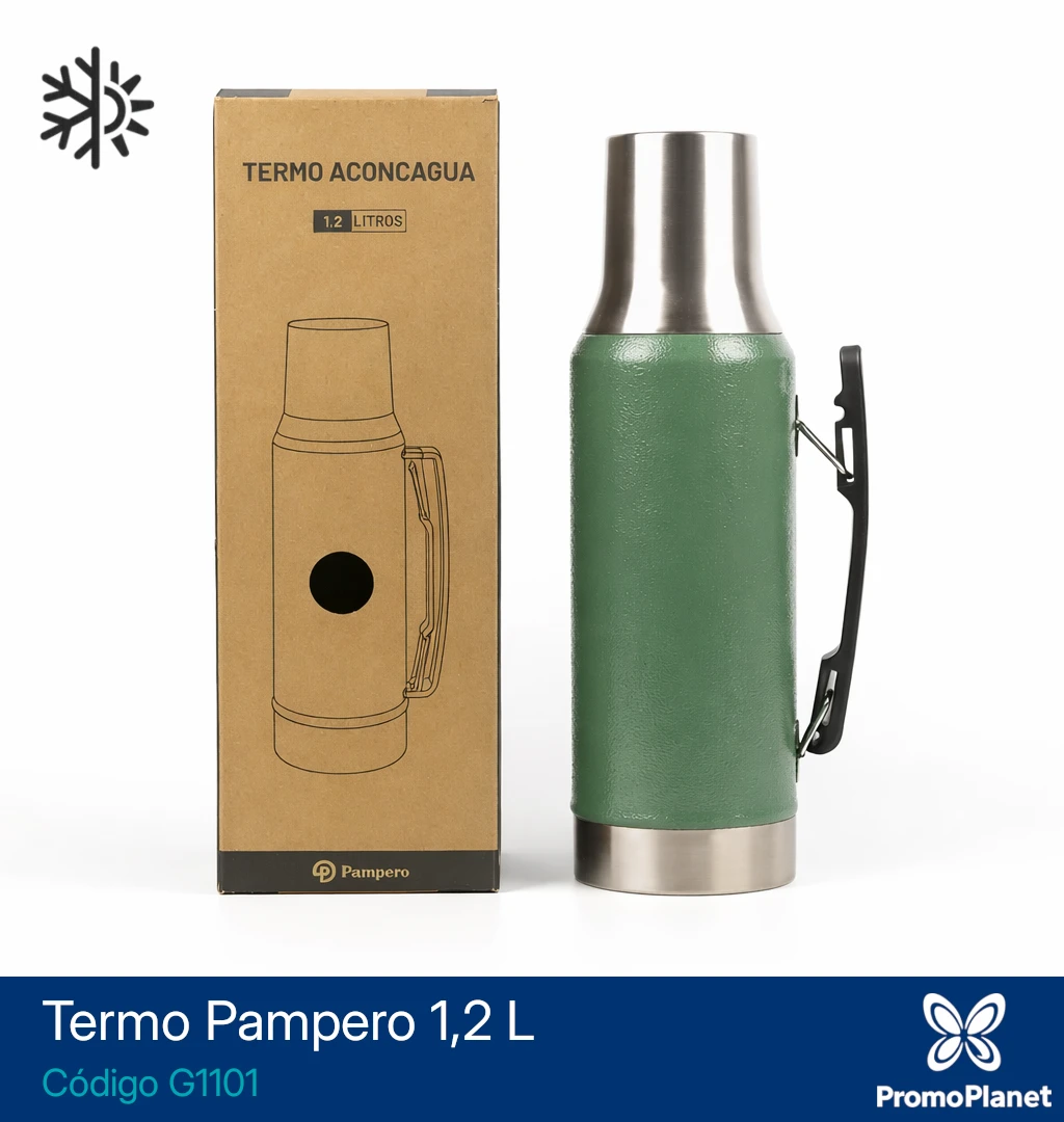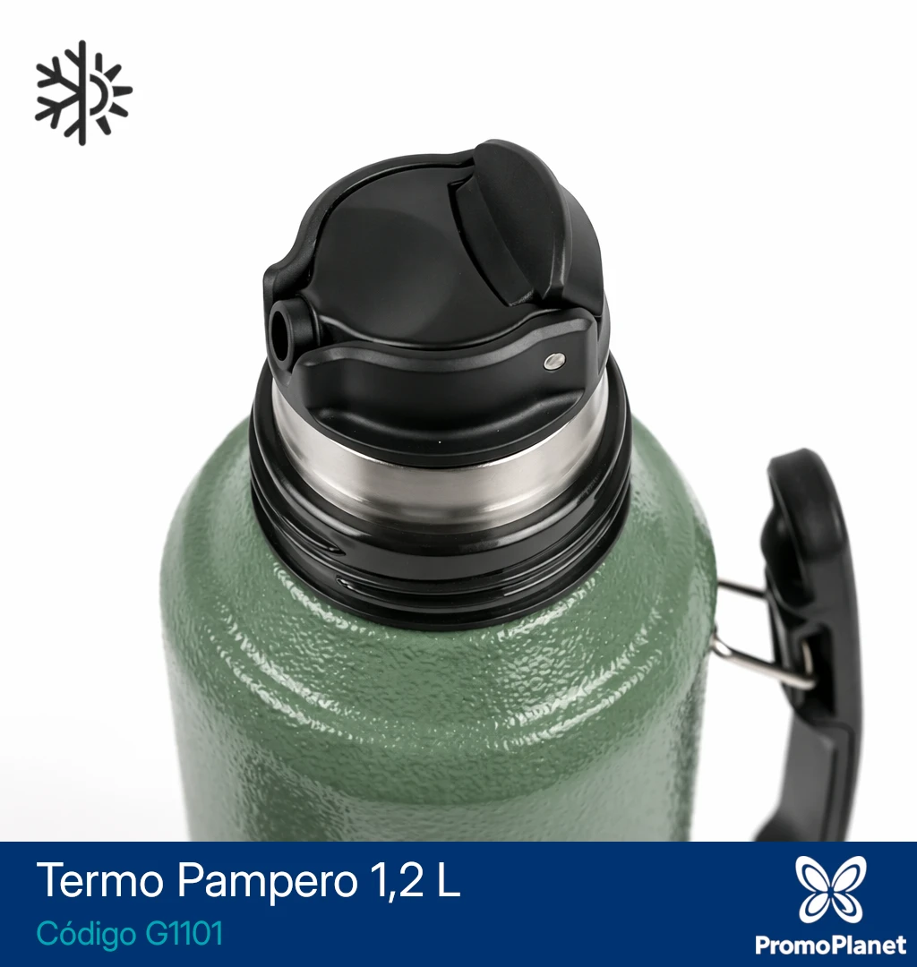 El termo Pampero G1101 está fabricado con interior en acero inoxidable 304 y exterior en acero 201, con estructura resistente y diseño funcional.