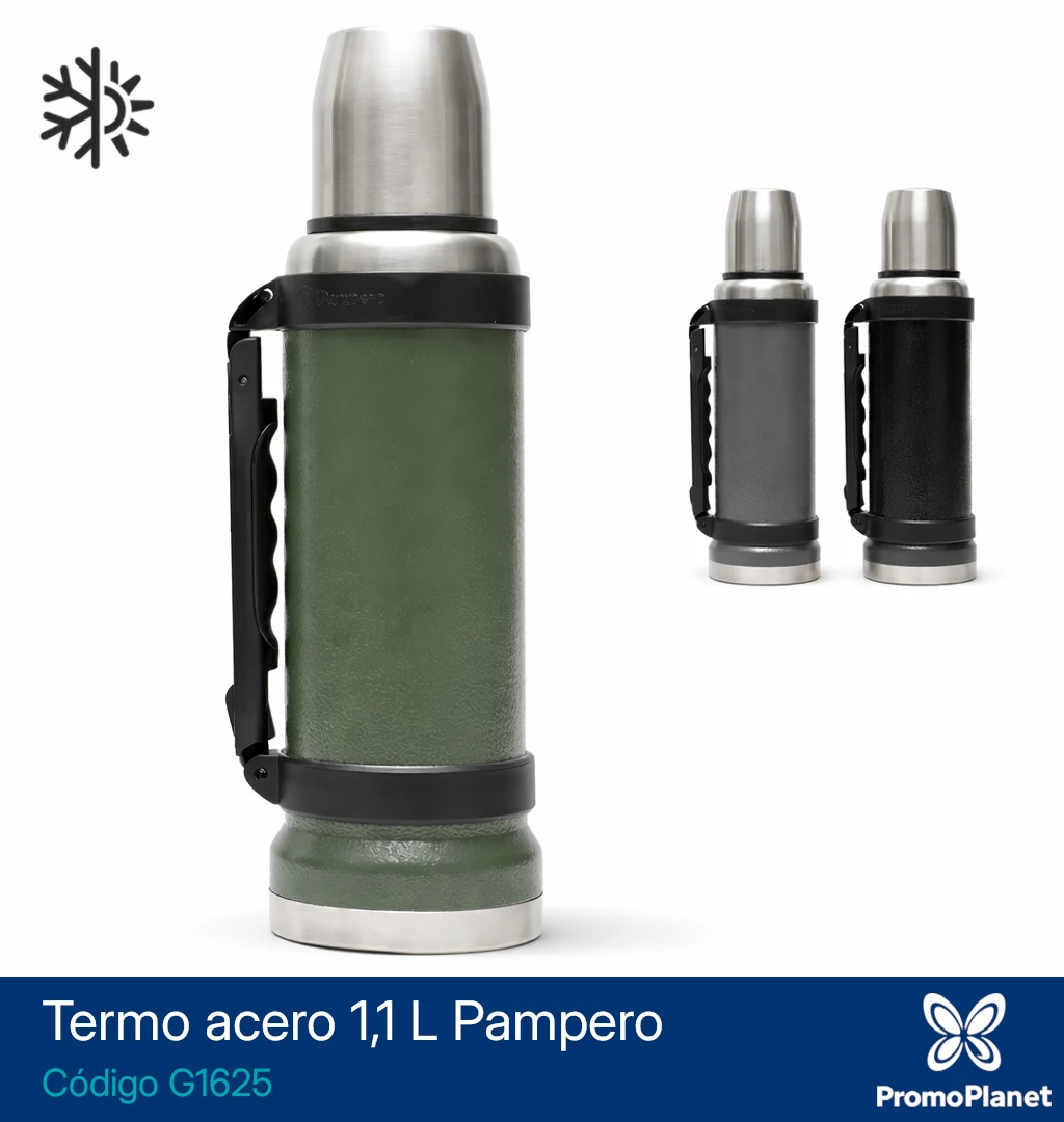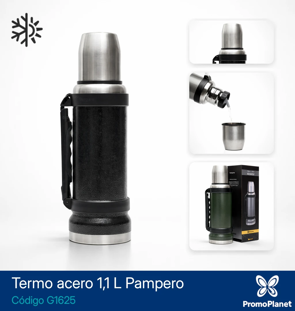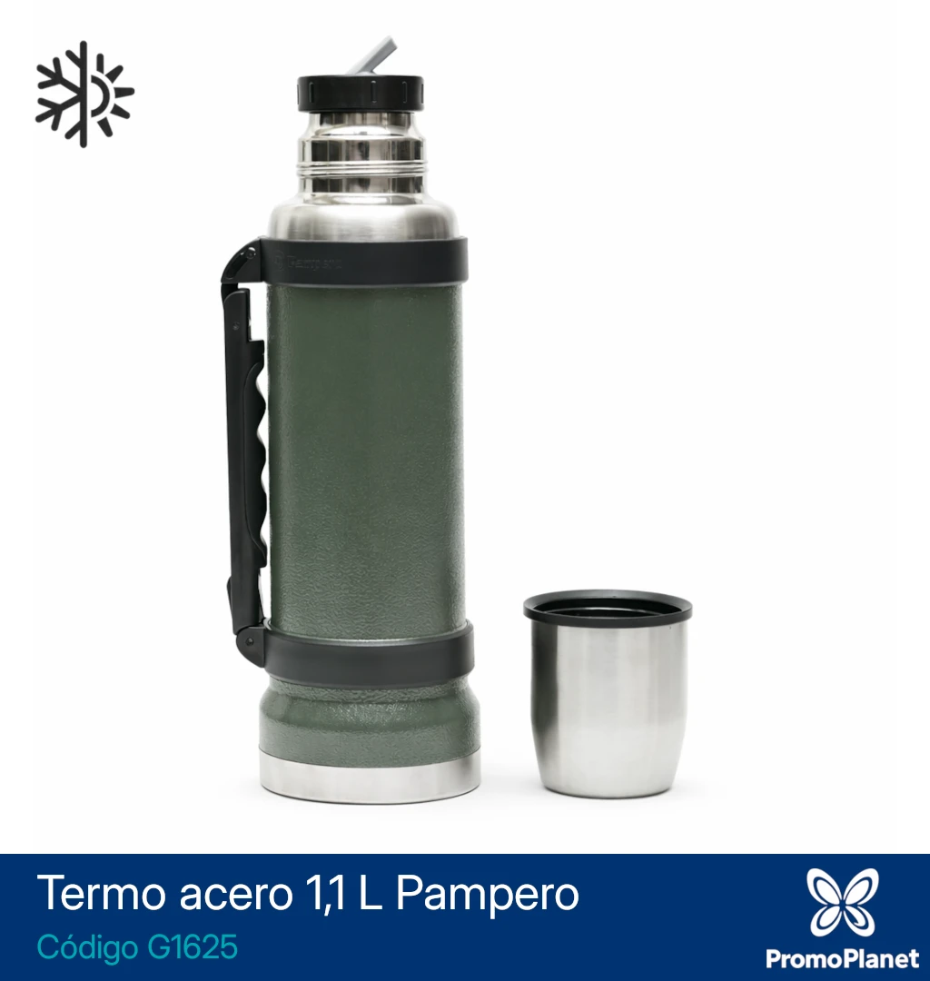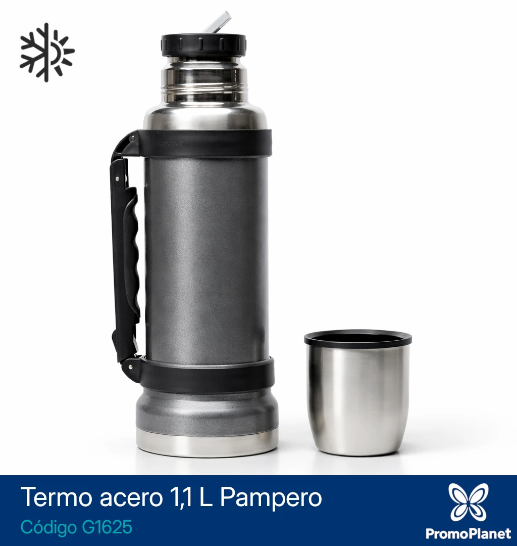 El termo G1625 Pampero está fabricado en acero inoxidable 304 con doble pared aislante, lo que permite conservar la temperatura del contenido hasta 18 horas.